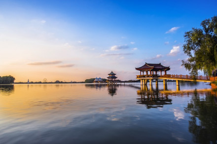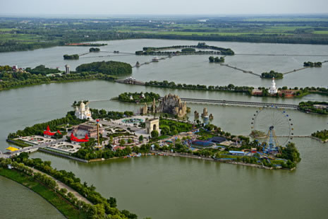 五冠橋位于旅游區(qū)主景觀帶的環(huán)湖路景觀帶上,它是根據(jù)揚(yáng)州瘦西湖五亭橋所建,因橋上建有五個(gè)亭子,便被稱為“五亭橋”。景區(qū)內(nèi)的五亭橋把五個(gè)亭子改成了形狀如冠的形狀,其余均同五亭橋,所以又名“五冠橋”。