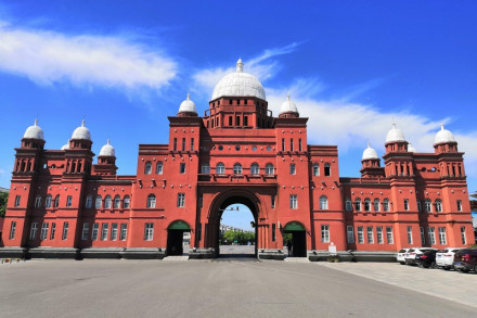 天下第一門是八里河旅游區(qū)的主園區(qū)大門。它綜合了俄、英、美三國的建筑特點(diǎn),造就了具有八里河藝術(shù)風(fēng)格的建筑,也是景區(qū)的標(biāo)志性建筑。這個(gè)樓堡式大門共有13個(gè)白色圓頂,中間一個(gè)較為突出,外墻飾有猩紅色的噴砂。