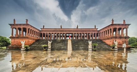 宙斯神廟原型位于希臘奧林匹亞村奧林匹亞山上,是為了祭祀宙斯而建,它是古希臘最大的神廟之一。八里河旅游區(qū)的宙斯神廟是依照復(fù)原的模型建造的,整座建筑鳥瞰成U型,上面覆蓋著錯(cuò)層框架式屋頂。