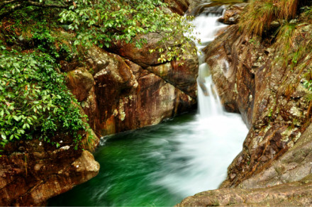 牯牛降雨量充沛,溪流縱橫,溪水常流不斷,潺潺流水,從山頂淙淙而下,遇有石壁斷崖,飛瀉直下形成一道道水瀑,大的如銀河落九天,空谷轟鳴,水汽升騰;小的似白練輕垂,涓涓細流,如泣如訴。十步一小瀑,百步一大瀑,飛瀑相連,蔚為壯觀。溪流碧綠清澈,時深時淺,時緩時急,在山間林里穿行,每遇石凼平地,則形成一個個大小不一的清潭,晶瑩剔透,異彩紛呈,如同一塊塊翡翠,每至雨季,潭瀑相應(yīng),山色朦朧,如一幅幅墨染的山水圖畫。