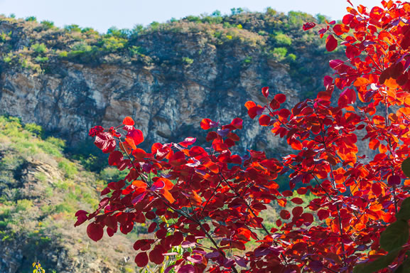 坡峰嶺景區(qū)春天時(shí)黃櫨花開,"三千粉色,花明如繡",滿樹毛絨的粉紅色黃櫨花傾灑在山谷中,層層迭迭,如粉色霧靄,置身其中如夢(mèng)似幻。秋天時(shí)漫山紅葉,"紅葉綠中游,彩練當(dāng)空舞",種類豐富的植物資源使這里成為流動(dòng)的色彩海洋,猶如一幅波瀾壯闊的紅葉畫卷。