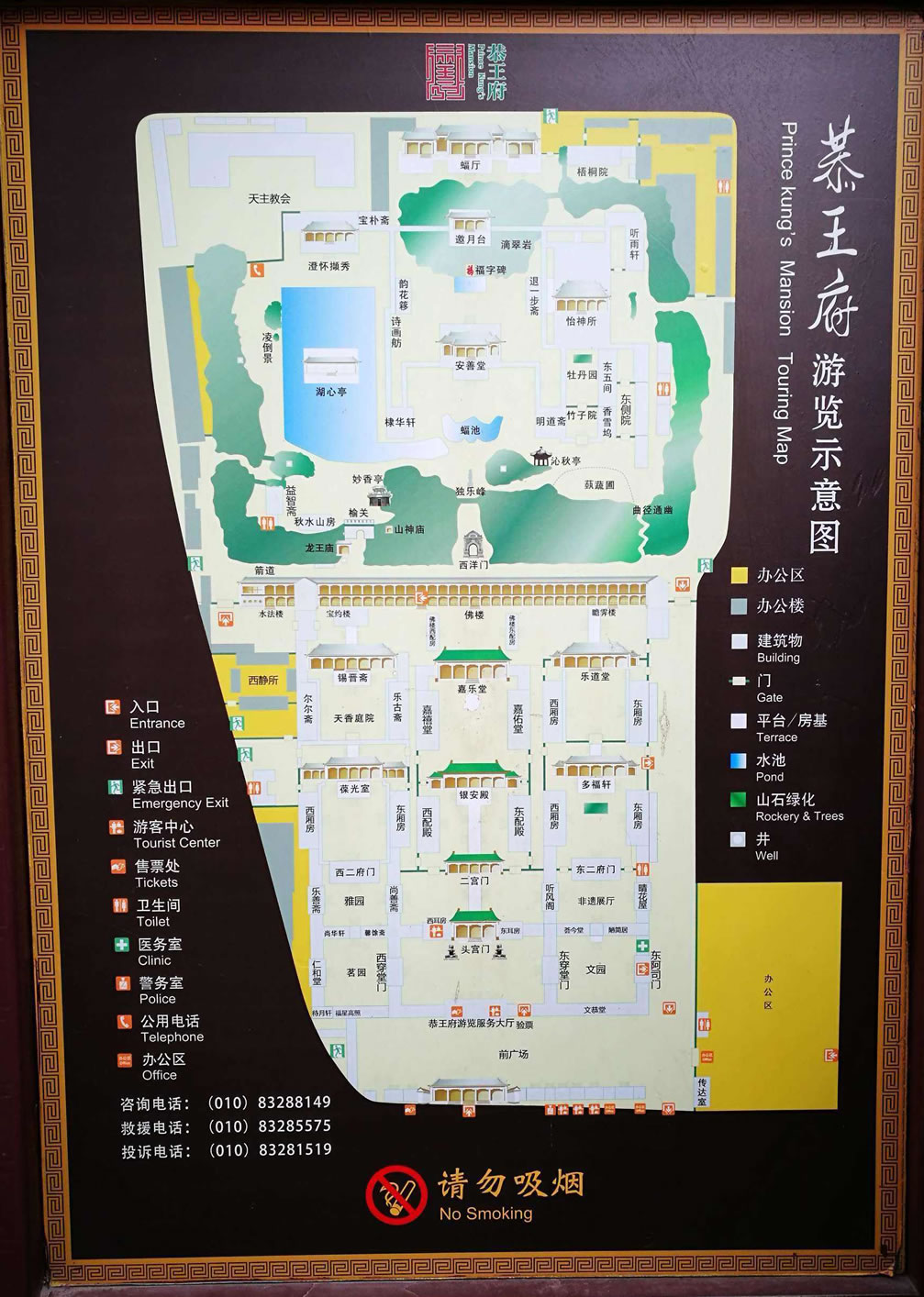 王府中路主要為銀安殿和嘉樂堂,主為祭祀之用;東路主要為多福軒和樂道堂,多福軒廳前有一架長了兩百多年的藤蘿,在京城極為罕見。東路的后進院落正房名為“樂道堂”,是當(dāng)年恭親王奕訢的起居處。西路的四合院落較為小巧精致,主體建筑為葆光室和錫晉齋。錫晉齋即為恭王府“楠木殿”,殿內(nèi)雕刻皆為楠木所成,是和珅仿紫禁城寧壽宮式樣。府邸最深處建有兩層的后罩樓,又稱藏寶樓,其后墻一共有44個什錦窗,相傳和珅可以根據(jù)窗戶的形狀,來對應(yīng)寶物的種類。園區(qū)內(nèi)“西洋門”、“福字碑”、“大戲樓”合稱恭王府三絕。府內(nèi)滿園“!弊帧6噙_一萬多個,與康熙“福字碑”共同組建恭王府“福”文化。