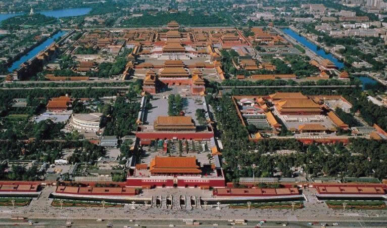 故宮位于北京城中心,布局依據(jù)《周禮·考工記》中所載:“左祖、右社、面朝、后市”的原則,建筑在北京城南北長八公里的中軸線上,南北取直,左右對稱。如今故宮左前面的勞動人民文化宮,明清是皇帝祭祀祖宗的太廟;右前面的中山公園是皇帝祭祀土神和谷神的社稷壇;前面有朝臣辦事的處所;后面有人們進(jìn)行交易的市場。北京故宮的北面是萬歲山,南面是金水河,恰好符合古人“負(fù)陰抱陽,沖氣為和”的建宮原則,萬歲山是專門為營造皇城風(fēng)水而筑城的一座人工山,完成于明初,位于元代寢宮延春閣舊址,用開挖護(hù)城河和南湖的淤泥堆積而成。此山的堆筑,一方面滿足了皇城要“負(fù)陰”的原則,另一方面又鎮(zhèn)住了前朝的風(fēng)水,故萬歲山又有“鎮(zhèn)山”之稱。北京四九城的布局是二龍出水護(hù)著紫禁城。依照中國古代星象學(xué)說,紫微星(即北極星)位于中天,乃天帝所居,天人對應(yīng),是以皇帝的居所又稱紫禁城。