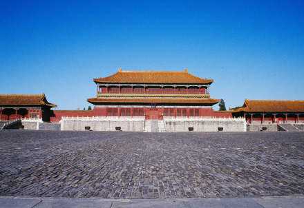 午門是故宮的正門。俗稱五鳳樓。東西北三面以12米高的城臺相連,環(huán)抱一個方形廣場。有1組建筑。正中有重樓,是9間面寬的大殿,重檐廡殿頂,在左右伸出兩闕城墻上,建有聯(lián)檐通脊的樓閣四座,明廊相連,兩翼各有13間的殿屋向南伸出,四隅各有高大的角亭,輔翼著正殿。這組城上的建筑,是故宮宮殿群中第一高峰。午門是皇帝下詔書、下令出征的地方。它當(dāng)中的正門平時只有皇帝才可以出入;皇帝大婚時皇后進(jìn)一次;殿試考中狀元、榜眼、探花的三人可以從此門走出一次。文武大臣進(jìn)出東側(cè)門,宗室王公出入西側(cè)門。