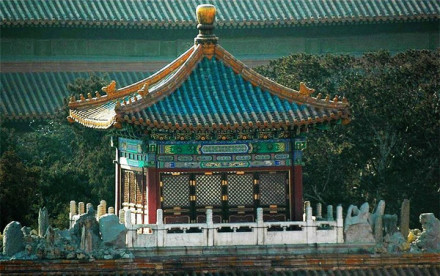 御景亭位于御花園內(nèi)東側(cè)的假山頂上。原是明代觀花殿的舊址,萬歷間改堆假山。山的東西山石間各有登道,拾級而上可達(dá)山頂御景亭。亭子平面方形,四柱,一斗二升交蔴葉斗栱,攢尖頂,上覆翠綠琉璃瓦,黃色琉璃瓦剪邊,鎏金寶頂,四面設(shè)隔扇門。四周圍繞著漢白玉石欄板。亭內(nèi)天花藻井,面南設(shè)寶座。御景亭是皇帝、皇后在農(nóng)歷九月初九重陽節(jié)登高的地方。自亭上可俯瞰宮苑,遠(yuǎn)眺故宮、景山、西苑。