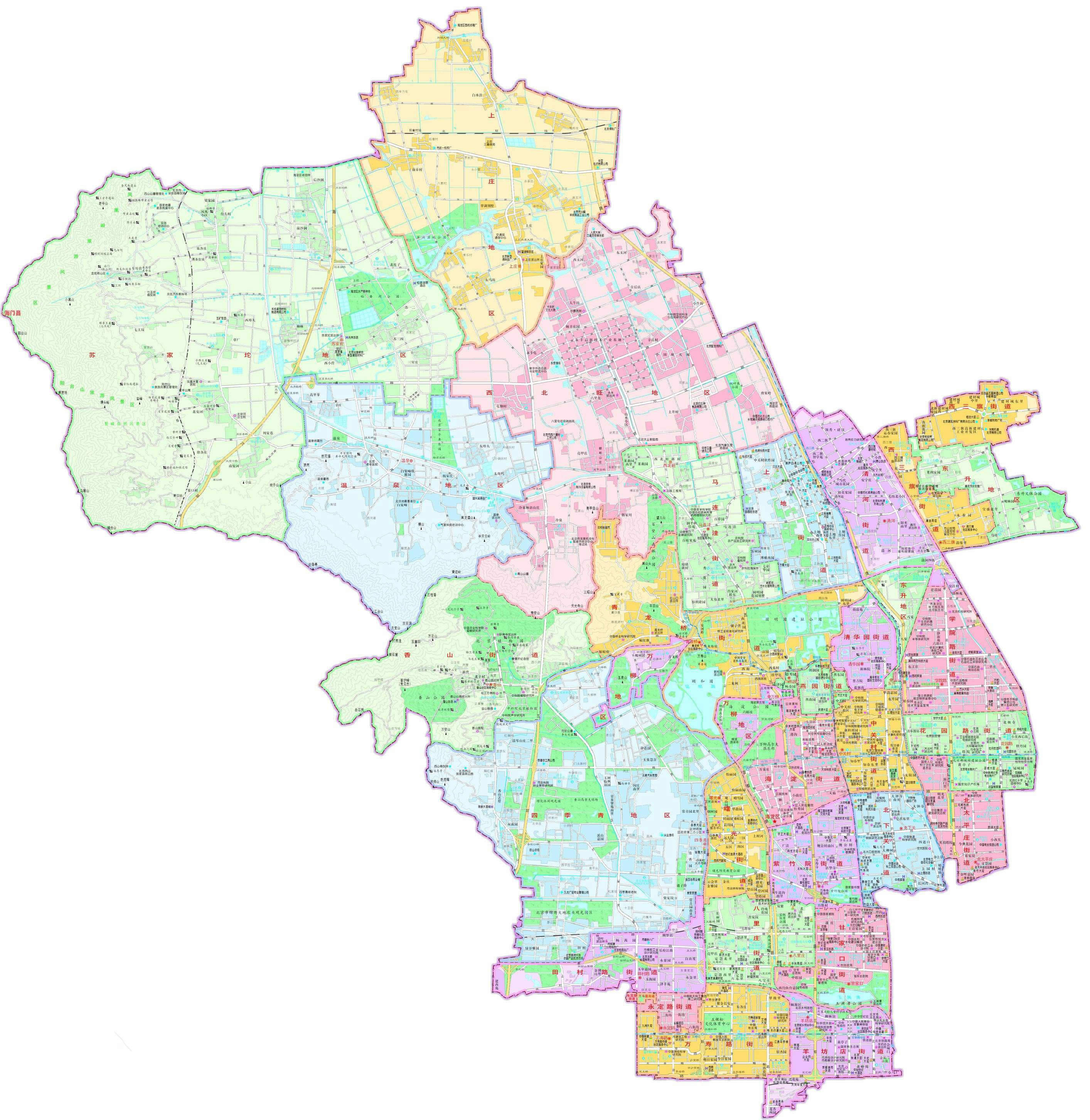 街道:萬(wàn)壽路街道、永定路街道、羊坊店街道、甘家口街道、八里莊街道、紫竹院街道、北下關(guān)街道、北太平莊街道、學(xué)院路街道、中關(guān)村街道、海淀街道、青龍橋街道、清華園街道、燕園街道、香山街道、清河街道、花園路街道、西三旗街道、馬連洼街道、田村路街道、上地街道、曙光街道
