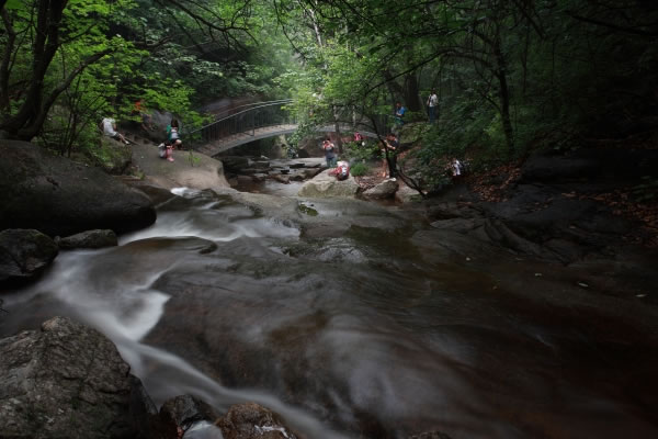 云岫谷景區(qū) 云岫谷景區(qū)位于新城子鎮(zhèn)遙橋峪村,海拔2116米,景區(qū)內(nèi)植被覆蓋率達(dá)95%,集危峰兀立、怪石嶙峋、洞穴、峽谷、河溪、潭瀑、花卉、森林為一體,野生動(dòng)物眾多,古堡、敵樓、烽火臺(tái)、營(yíng)城、水庫(kù)等人文資源豐富,尤以水秀石紅的地質(zhì)現(xiàn)象和冰川漂礫奇石出奇。景區(qū)內(nèi)山、石、洞、谷、河、潭錯(cuò)落有序,從串珠湖到傳說(shuō)中的七仙女下凡沐浴的七仙潭,自然景觀達(dá)40余處;此外還有劉伯溫草廬、烽火臺(tái)等人文景觀。 云岫谷景區(qū)外圍的霧靈湖始建于1984年 ,是一座中型人工湖,流域面積178平方公里,庫(kù)容量2000萬(wàn)立方米。它坐落于霧靈山腳下,山清水秀,空氣清新,游霧靈湖、享生態(tài)度假,住民俗新村、體驗(yàn)風(fēng)俗民情;乘船游霧靈湖,欣賞環(huán)山紅葉。霧靈湖主壩是華北唯一一座水泥鋼筋結(jié)構(gòu)的空心壩,是休閑度假的好去處。1991年,時(shí)任中共中央總書(shū)記的江澤民同志來(lái)此度假,面對(duì)青山秀水,他欣然題詞:“湖光山色,盡收眼底”。