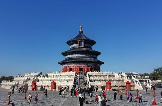 祈年殿:始建于明永樂十八年(1420年),初名“大祀殿”,為一矩形大殿,用于合祀天、地。明嘉靖二十四年(1545年),改為三重檐圓殿,殿頂覆蓋上青、中黃、下綠三色琉璃,寓意天、地、萬物,并更名為“大享殿”。清乾隆十六年(1751年),改三色瓦為統(tǒng)一的藍(lán)瓦金頂,定名“祈年殿”,是孟春(正月)祈谷的專用建筑。祈年殿殿高38.2米,直徑24.2米,內(nèi)部開間還分別寓意四季、十二月、十二時(shí)辰以及周天星宿,是僅存的一例中國古代明堂式建筑。