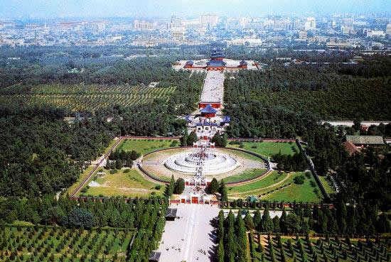 天壇公園由兩道壇墻環(huán)繞,被分為“內(nèi)壇”“外壇”兩部分;域北呈圓形,南為方形,寓意“天圓地方”;主要由春季祈禱豐年的“祈谷壇”,冬至日祭天的“圜丘壇”,皇帝祭祀前居住的齋宮、演習(xí)祭祀禮樂的神樂署四大古建筑群組成;祈谷壇中的祈年殿是北京市的標(biāo)志性建筑。天壇公園外壇種植有大量古柏林。