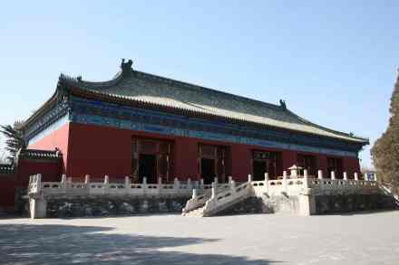 無梁殿:即齋宮正殿,建于明永樂十八年(1420年)。此殿因以磚拱承重,不用梁枋而得名。皇帝進(jìn)出齋宮均在此舉行有關(guān)禮儀,F(xiàn)殿內(nèi)按乾隆時(shí)期原貌陳列,橫額“欽若昊天”為乾隆御筆,屏風(fēng)、寶座均為原物。