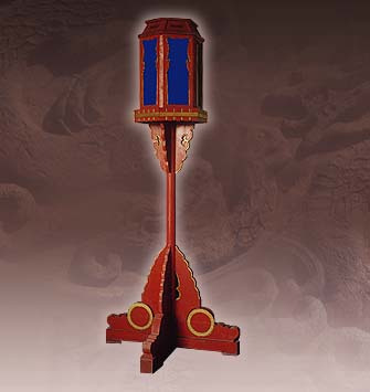 通高191厘米,燈罩邊長(zhǎng)34厘米,托座邊長(zhǎng)50厘米,高55厘米,寬42厘米,攢頤尖頂高8.5厘米,寬34厘米,六棱。底座長(zhǎng)79厘米。座燈由燈罩、底座兩部分組成,燈罩六棱,上收,平頂,每面鑲透明玻璃。底座上以圓立柱支撐托座,以承燈罩。底座四歧呈十字形。通身紅色金緣。插燈與座燈同,只是底座插在石礎(chǔ)內(nèi),置于殿內(nèi)及路側(cè)。