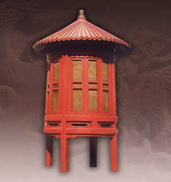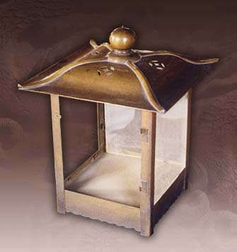 清末造。通高36.5厘米,檐方28厘米,足方20.6厘米。方形,四邊銅框,凹面玻璃心,一面為門,銅框兩側(cè)、底云花裝飾,挑形活頁二,桃形吊環(huán),底邊有花紋,蓋頂穹隆形,四脊間飾四縷空金錢眼紋,頂飾圓尖鈕。陳設(shè)于祭壇正位前和臺(tái)階上,用于祭祀時(shí)照明。