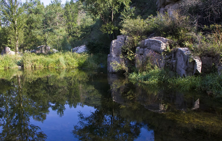 雙秀峰自然風(fēng)景區(qū) 雙秀峰自然風(fēng)景區(qū)位于大莊科鄉(xiāng)大青溝村東,鐵爐村南1.5公里,鄉(xiāng)駐地南7.8公里處。南與昌平接壤,北有鐵爐村,西沙梁村,東有大秦鐵路鐵爐火車(chē)站,西為連綿群山。雙峰并峙,直插云霄,中有一條石縫,故名。海拔672米,整個(gè)山峰大部分為褚紅色粗糙花崗巖,山西北側(cè)有匯泉而成的溪流,是碓石口河(東沙河)發(fā)源地。