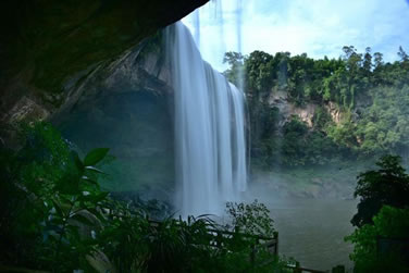 水簾洞位于瀑布下方,由整塊的巨巖組成。巨巖由砂巖青石構(gòu)成,面積有上萬平方米。水簾洞內(nèi)能以360度的全景視角觀賞到大瀑布“飛流直下三千尺,疑是銀河落九天”的恢宏氣勢,體驗與瀑布親密接觸的清爽,領(lǐng)略春雨瀟瀟、秋雨綿綿、夏雨磅礴的四季風(fēng)雨情致,有奇妙的季節(jié)穿越之感。