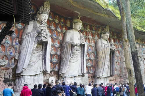 重慶市的大足石刻以其規(guī)模宏大、雕刻精美、題材多樣、內(nèi)涵豐富和保存完整而著稱于世。它集中國(guó)佛教、道教、儒家“三教”造像藝術(shù)的精華,以鮮明的民族化和生活化特色,成為中國(guó)石窟藝術(shù)中一顆璀璨的明珠。它以大量的實(shí)物形象和文字史料,從不同側(cè)面展示了九世紀(jì)末至十三世紀(jì)中葉中國(guó)石刻藝術(shù)的風(fēng)格和民間宗教信仰的發(fā)展變化,對(duì)中國(guó)石刻藝術(shù)的創(chuàng)新與發(fā)展做出了重要貢獻(xiàn),具有前代石窟不可替代的歷史、藝術(shù)和科學(xué)價(jià)值。許多歐洲人、尤其是法國(guó)人,對(duì)大足石刻寵愛倍加。