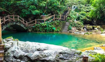 雙龍戲珠是峽谷溪流中一塊天然形成的石頭,仿佛巨大的珠子將潺潺流水分成兩道,流水猶如兩條靈動(dòng)的小白龍圍繞著龍珠嬉戲游玩,故名雙龍戲珠。