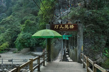 石皇傘位于河谷中央,兩塊30噸重的巨石緊緊地疊在一起像一把巨傘。為崩塌遺跡景觀,巖壁崩塌至谷底后受到谷底山洪沖蝕作用,因上下巖層強(qiáng)度差異,蹦落體下部遭受洪水沖蝕的強(qiáng)度大,小塊松散物被帶走,巖石變細(xì);崩落體上部巖石由于受河水沖蝕作用弱而保持原樣,其形狀很像一把撐開的大傘,故名石皇傘。