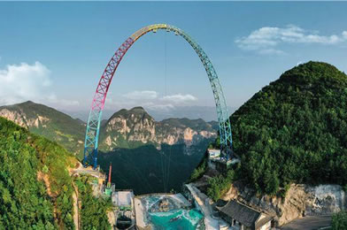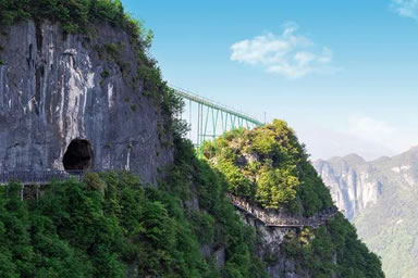 云端廊橋建在龍缸海拔1010米的絕壁之巔,懸挑長(zhǎng)度26.68米,比美國(guó)科羅拉多大峽谷玻璃廊橋長(zhǎng)5米多,位居世界第一。廊橋橋面、護(hù)欄采用全通透超白玻璃制作,可720度觀(guān)景。其造型設(shè)計(jì)、透視效果、驚險(xiǎn)刺激程度全球領(lǐng)先。廊橋上每年要舉行世界低空跳傘大賽,人們可在驚險(xiǎn)刺激的空中飄移中欣賞自然風(fēng)光。