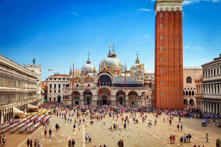 圣馬可廣場 圣馬可廣場(Piazza San Marco) ,官方標(biāo)準(zhǔn)譯名圣馬爾谷廣場,又稱威尼斯中心廣場,一直是威尼斯的政治、宗教和傳統(tǒng)節(jié)日的公共活動中心。圣馬可廣場是由公爵府、圣馬可大教堂、圣馬可鐘樓、新、舊行政官邸大樓、連接兩大樓的拿破侖翼大樓、圣馬可大教堂的四角形鐘樓和圣馬可圖書館等建筑和威尼斯大運河所圍成的長方形廣場,長約170米,東邊寬約80米,西側(cè)寬約55米。廣場四周的建筑從中世紀(jì)到文藝復(fù)興時代都有。 圣馬可廣場初建于9世紀(jì),當(dāng)時只是圣馬可大教堂前的一座小廣場。馬可是圣經(jīng)中《馬可福音》的作者,威尼斯人將他奉為守護(hù)神。相傳828年兩個威尼斯商人從埃及亞歷山大將耶穌圣徒馬可的遺骨偷運到威尼斯,并在同一年為圣馬可興建教堂,教堂內(nèi)有圣馬可的陵墓,大教堂以圣馬可的名字命名,大教堂前的廣場也因此得名“圣馬可廣場”。