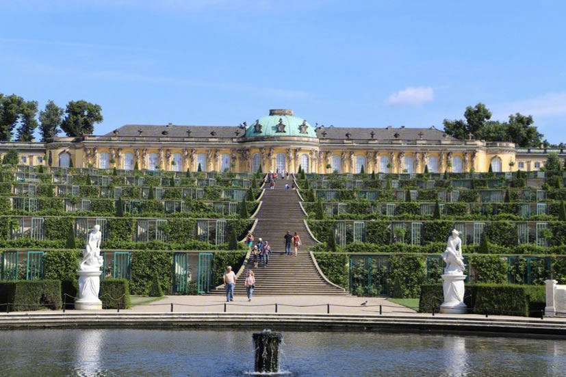 無憂宮 無憂宮(Sanssouci Palace)是18世紀德意志王宮和園林,位于德國波茨坦市北郊,為普魯士國王腓特烈二世模仿法國凡爾賽宮所建。宮名取自法文的“無憂”或“莫愁”。整個王宮及園林面積為90公頃,因建于一個沙丘上,故又稱“沙丘上的宮殿”。無憂宮是18世紀德國建筑藝術(shù)的精華,全部建筑工程延續(xù)時間達50年之久。雖經(jīng)戰(zhàn)爭,但從未遭受炮火的轟擊,仍保存十分完好。 宮殿正殿中部為半圓球形頂,兩翼為長條錐脊建筑。殿正中為圓廳。瑰麗的首相廳,天花板上裝潢富有想象力,四壁鑲金,光彩奪目。室內(nèi)多用壁畫和明鏡裝飾,輝煌璀璨。宮殿前有平行的弓形6級臺階 ,兩側(cè)和周圍由翠綠叢林烘托 。宮殿前有噴泉,正對著大殿門廊。此噴泉采用圓形花瓣石雕,四周有“火”、“水”、“土”、“氣”4個圓形花壇陪襯,花壇內(nèi)塑有神像,尤以維納斯像和水星神像造型精美,形象生動。 據(jù)說整個宮內(nèi)有1000多座以希臘神話人物為題材的石刻雕像。宮殿東側(cè)還有珍藏124 幅名畫的畫廊,這些繪畫多為文藝復興時期意大利、荷蘭畫家的名作。畫廊寬敞明亮,每逢佳節(jié),這里都舉辦音樂會;▓@內(nèi)有一座六角涼亭,采用中國傳統(tǒng)的碧綠筒瓦、金黃色柱、傘狀蓋頂、落地圓柱結(jié)構(gòu),被稱為“中國茶亭”。亭內(nèi)桌椅完全仿造東方式樣制造,亭前矗立著中國式香鼎。