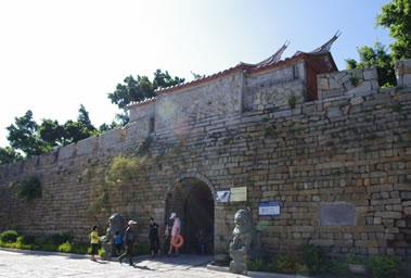 城內(nèi)有四個(gè)城門,南北門相距約500多米,東西門相距約300多米。東、西、北三座城門相似,各有兩道城門,外加筑月城,上建城樓,城門上各設(shè)烽火臺一座,南城門則外加設(shè)一照墻,照墻前有一尊關(guān)公雕像。相傳當(dāng)年倭寇炮轟城池,城內(nèi)關(guān)帝廟的關(guān)云長把青龍偃月刀一揮,炮彈被撥落在城墻旁,再一揮,炮彈射回賊船,于是船沉寇亡。西門的兩道城門如今依舊完好地保留下來。蔭涼的城門下擺有幾個(gè)小攤子。城內(nèi)的十字大街聯(lián)結(jié)著四個(gè)城門,街道則由一塊塊石板鋪就而成。
