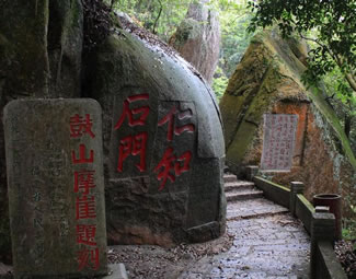 第四亭:“半山亭”。由第三亭至此,共有494級(jí)臺(tái)階。亭在半嶺,故名。過(guò)此亭百余階,有石刻“路通仙苑”,轉(zhuǎn)小徑可達(dá)“十八洞景”!鞍肷酵ぁ焙蠼300階有石刻“桃?guī)r洞口”,往東可到桃?guī)r洞,桃花精舍。