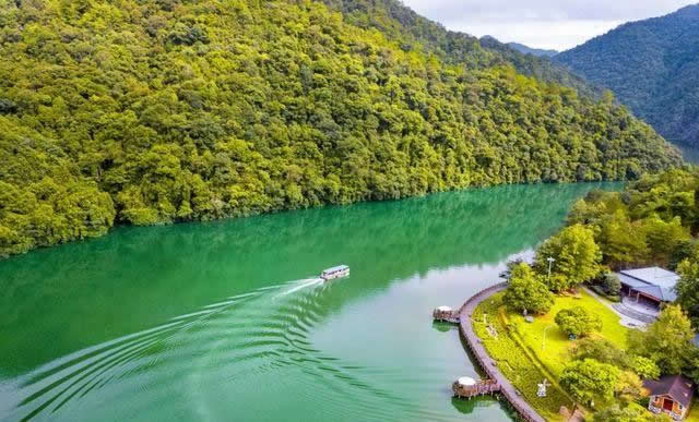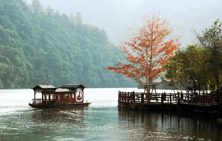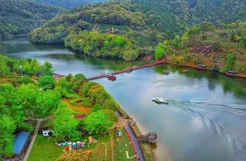 景區(qū)中的水域長達(dá)七公里,清澈的水流,色彩斑斕的山林倒影,構(gòu)成生機(jī)勃勃的山水畫卷,使人有“舟行碧波上,人在畫中游”的親切感受。這里是各種野生動植物的聚集地,有各種奇花異草和珍禽走獸。每年年底到次年的初夏,總有一大群鴛鴦飛臨此地,在這水質(zhì)清純、環(huán)境優(yōu)美的地方過冬,為景區(qū)增添了愛的溫馨,傳播愛的信息。