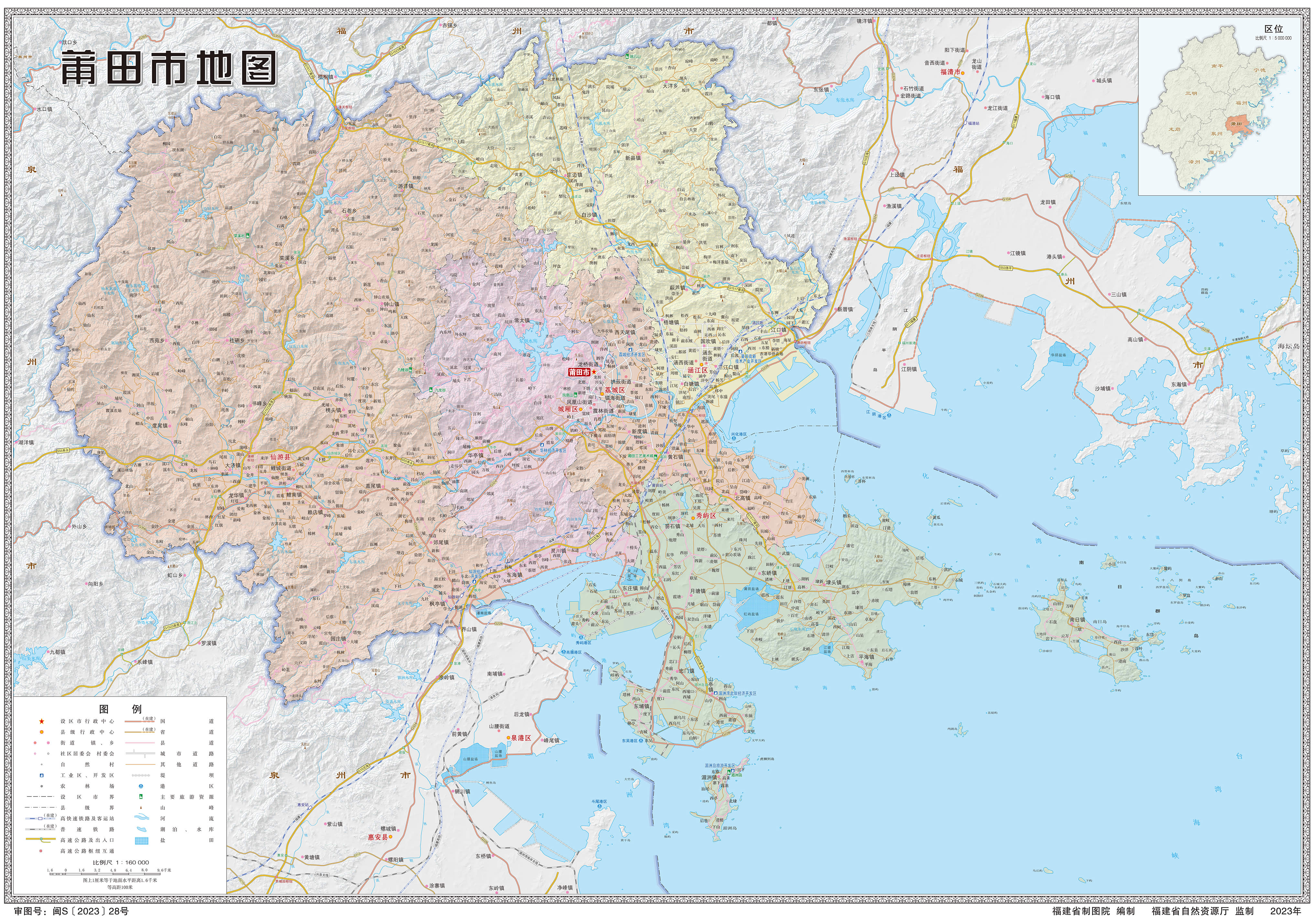 大陸海岸線,由北至南興化灣、平海灣和湄洲灣3個海灣相連而成。大陸岸線漫長曲折,總長336千米。直線距離與岸線長度之比的曲折率高達1:7.67。分布有基巖岸、沙岸、淤泥岸、紅樹林岸、河口岸等。大陸灘涂面積為281.19平方千米,0—5米淺海面積251.81平方千米,5—10米淺海面積255.83平方千米,10—20米淺海面積523.92平方千米。擁有閩中漁場面積729平方海里。在3個海灣前沿分布有267個海島,其中有居民島11個。境內海島均為大陸島,屬于基巖島。分布相對集中,呈明顯的鏈狀。構成南日群島、十八列島、虎獅列島等。