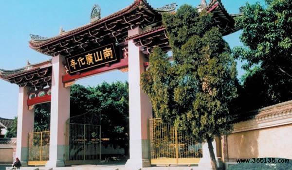 南山廣化寺:座落在城南鳳凰山,F(xiàn)行建筑群是清光緒初年依舊制重修的,從20世紀(jì)80年代開始,進行了大規(guī)模的擴建。山門照壁上有中國佛教會已故會長趙樸初題寫的“莊嚴(yán)國土,利樂有情”。廣化寺占地3.2萬多平方米,建筑物面積1.7萬平方米。踏入山門,沿著中軸線建筑拾級而上,全長385米。依次是照壁、牌坊、山門、放生池、彌勒殿(天王殿)、大雄寶殿、法堂(上為藏經(jīng)閣)、臥佛殿(下為祖堂);兩側(cè)翼建有寬敞的石柱廊廡,東側(cè)次第為東羅漢殿、鐘樓、五觀堂、伽藍殿、尊客堂、水云鄉(xiāng)、圓通門、溪聲閣;西側(cè)次第為西羅漢殿、鼓樓、學(xué)戒堂、祖師殿、凈行堂(念佛堂)、煙霞窟、方丈室、看山樓。寺后東西兩角的最高處,分別聳立著觀音閣和小南山。南山上有幾十株不知年代的蒼松翠柏。