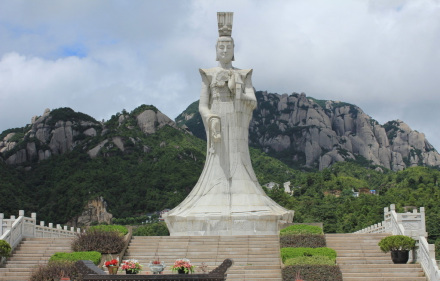 太姥娘娘雕像左邊是烏龍崗,右邊是虎頭崗,前眺東海福瑤列島,背靠摩霄峰。雕像由288塊花崗巖組成,疊高18層,高20.88米(含基座),臺(tái)階的臺(tái)數(shù)、級(jí)數(shù),都暗合道教所推崇的數(shù)字“九”。雕像造型方中有圓,以方為主,吸收了北魏石窟雕像的秀骨清相的特點(diǎn),揉進(jìn)少許盛唐時(shí)代人物面部的豐潤(rùn),同時(shí)又從漢俑中吸取單純簡(jiǎn)潔之韻味。