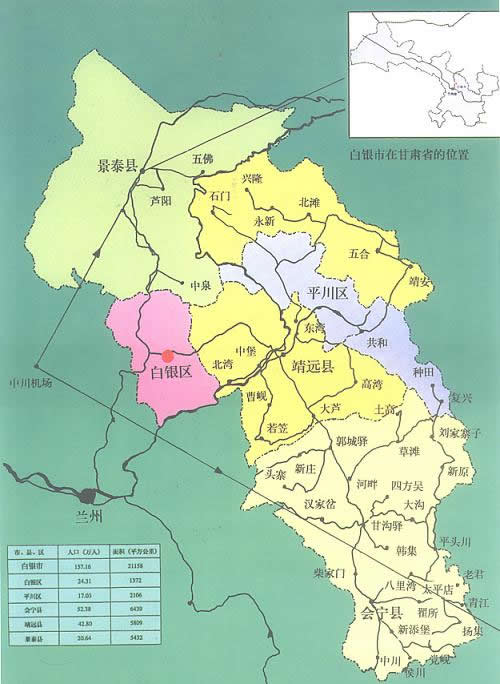 白銀區(qū) 面積1352平方千米,人口337645,政府駐白銀區(qū)天津路1號,下轄5個街道、3個鎮(zhèn)、2個鄉(xiāng)
