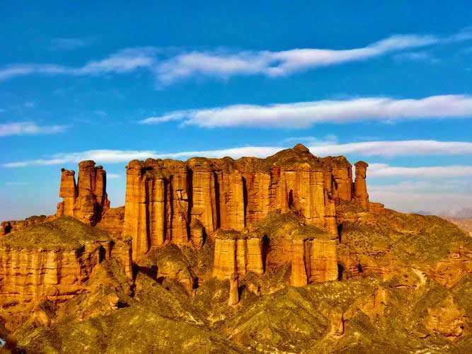 冰溝丹霞地貌以“雄、險、奇、幽、美”而著稱,是大自然鬼斧神工的杰作,素有“赤壁千仞”之稱,被譽(yù)為“天下第一奇觀”,是攝影愛好者的天堂。其主要特點(diǎn)是:類型豐富,造型奇特,形態(tài)多樣,組合良好世間罕見。有窗欞狀、柱廊狀、泥乳狀、疊板狀、陡崖狀、蘑菇狀、蜂窩狀等多種地貌形態(tài),以宮殿式、劣地式、糧囤式為主。它具有一般丹霞地貌發(fā)育所表現(xiàn)出來的丹霞石柱、崖壁、石墻、巷谷、一線天、孤峰殘丘等代表丹霞地貌發(fā)育各個階段的形態(tài)特征,其地貌表現(xiàn)為峰林結(jié)構(gòu)其山石高下參差,疏密相生,群峰林立,組合有序,千姿百態(tài),富有韻律感和層次感,在造型上有很強(qiáng)的表現(xiàn)力、可視性、可塑性和極高的觀賞性,因此又被譽(yù)為“大西北的紅色石林”。