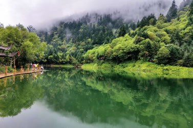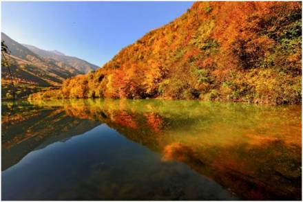 官鵝溝水美。13個(gè)大小不等、形態(tài)各異的湖泊,尤如一串綠色的珍珠鑲嵌在溝內(nèi),湖水清澈透底,隨湖底地貌高低呈不同顏色,那些倒映在湖中的古樹(shù)象一條條巨龍臥在湖底。藍(lán)天白云和青山古樹(shù),映入湖中,使天地渾然一體,沒(méi)有界限。