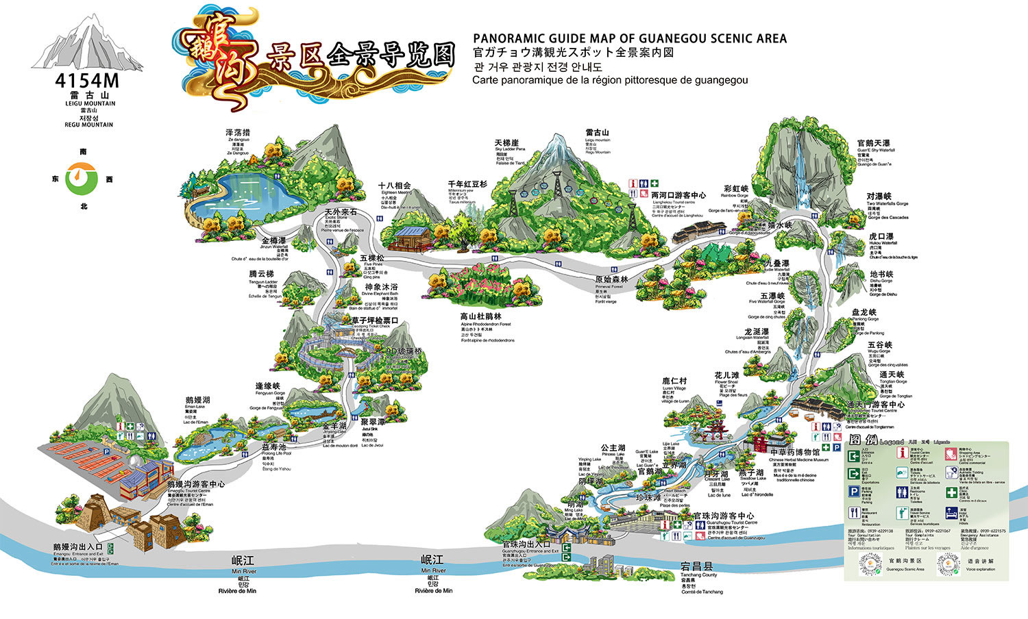 溝內(nèi)前14公里為13個(gè)色彩斑斕的湖泊,后18公里為松柏茂密的原始森林,有9道高聳入云的險(xiǎn)峻峽谷,有11處從山頂或半山懸崖上直瀉而小的大小瀑布,有60余處令人贊嘆的景點(diǎn),最深處為高山草甸和終年不化的雪山。