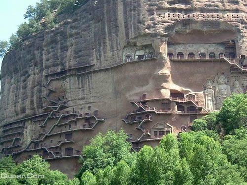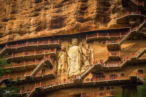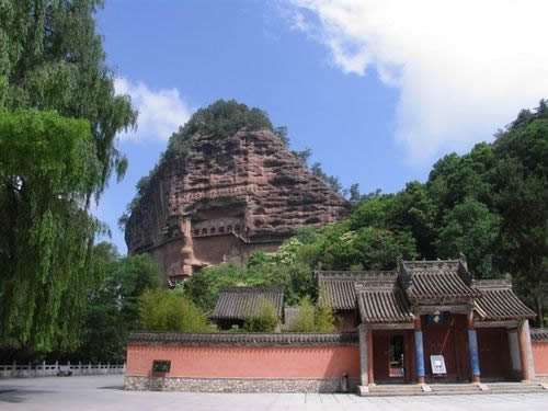 麥積山石窟坐落于西秦嶺東段,小隴山林區(qū)崇山峻嶺中,因山崖一峰突兀挺立,拔地而起,猶如農(nóng)家麥垛,故名麥積山。山高142m,頂端有隋代舍利磚塔,古老孑遺植物白皮松遍布塔周;懸崖絕壁上雕鑿著1600余年來的209個洞窟7866身泥塑石雕及1300多平米壁畫,為此麥積山石窟為中國四大石窟之一,有東方雕塑陳列館之稱。摩崖造像、凌空棧道與蒼松翠竹、赤壁丹崖相互映襯,有麥積煙雨等神奇景觀。