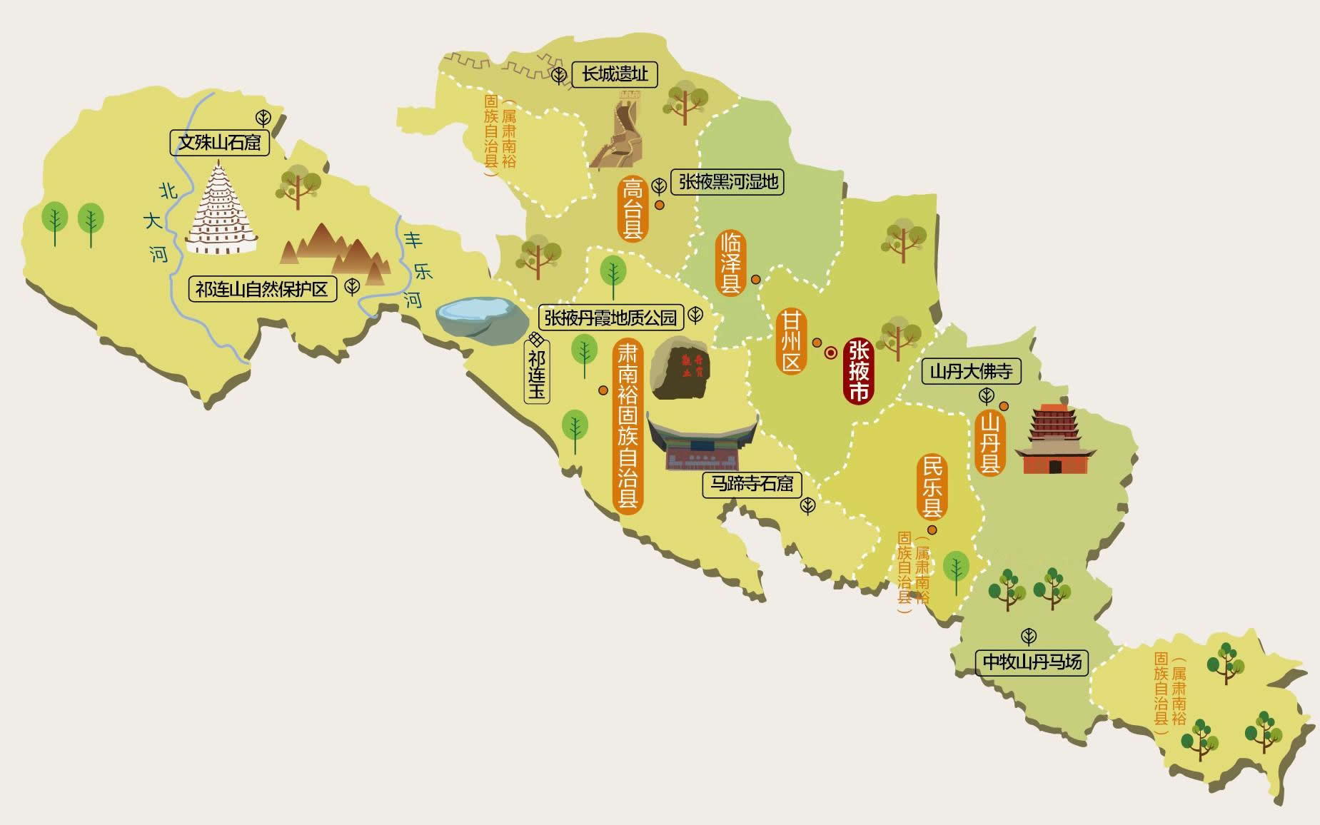 ·鎮(zhèn)遠(yuǎn)樓 ·肅南康隆寺獵場 ·張掖市森林公園 ·東大山 ·龍首山 ·道巷廟 ·甘州古塔 ·諸葛樓 ·東山寺和西武當(dāng) ·黑水國遺址及漢墓群