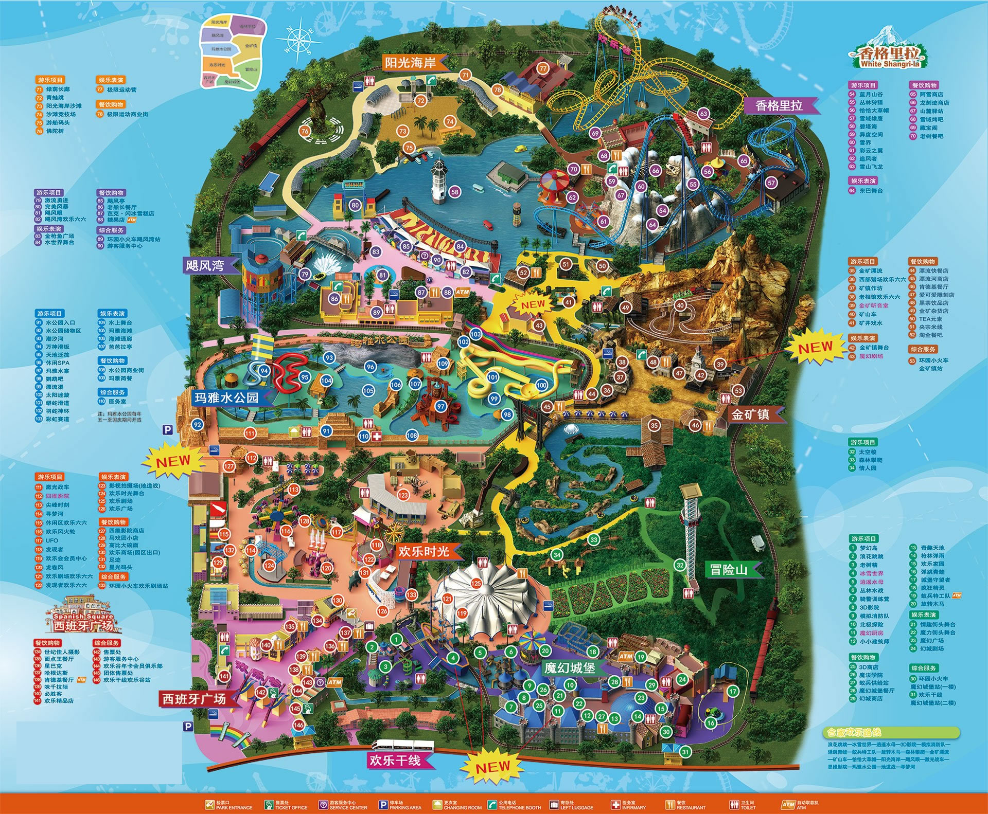 全公園共分八大主題區(qū):西班牙廣場、卡通城、冒險(xiǎn)山、歡樂島、金礦鎮(zhèn)、香格里拉森林、颶風(fēng)灣、陽光海岸,加上奇趣的瑪雅水公園,有一百多個(gè)老少皆宜、豐富多彩的游樂項(xiàng)目。從美國、荷蘭、德國等發(fā)達(dá)國家引入眾多全國乃至亞洲獨(dú)有的項(xiàng)目:世界最高落差的"激流勇進(jìn)"、中國第一座懸掛式過山車"雪山飛龍"、中國第一座巷道式"礦山車"、中國第一座"完美風(fēng)暴"、中國第一輛"仿古典式環(huán)園小火車"、亞洲最高、中國第一座"驚險(xiǎn)之塔"--太空梭、亞洲首座集視覺、聽覺、觸覺于一體的四維影院。這些游樂項(xiàng)目附以了逼真而完美的主題包裝,營造出環(huán)境優(yōu)美宜人,具有美國西部和中國藏北風(fēng)格的景觀。一次次驚心動魄的歷程,一個(gè)個(gè)撲朔迷離的故事,讓游客仿佛進(jìn)入一個(gè)亦真亦幻的神秘境界。
