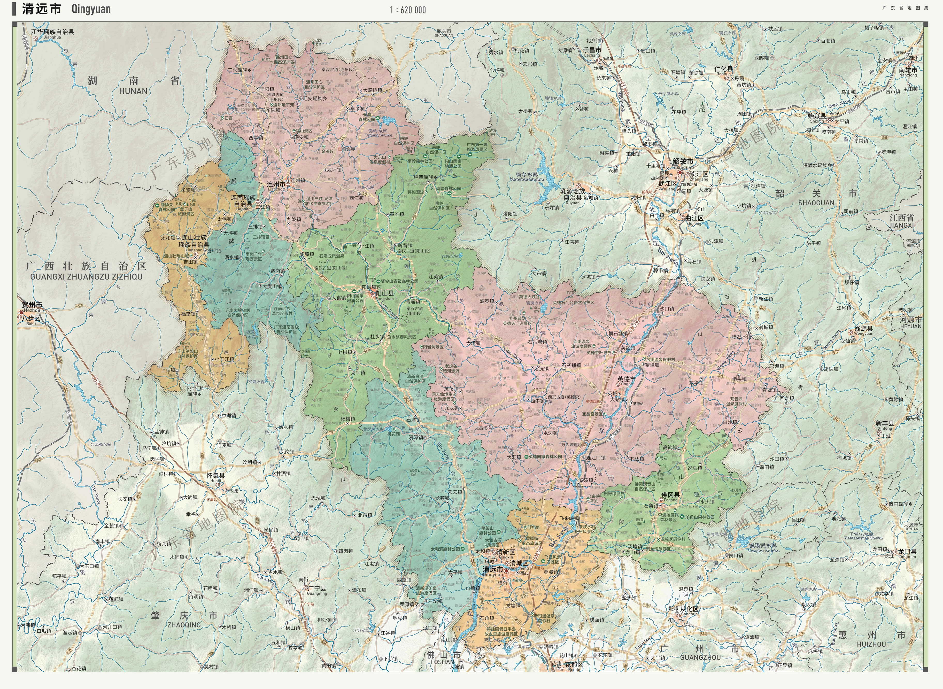 清遠(yuǎn)市轄2個(gè)市轄區(qū)、2個(gè)縣、2個(gè)自治縣,代管2個(gè)縣級(jí)市: