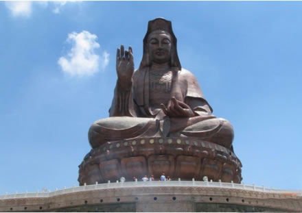 云海蓮臺地處西樵山風(fēng)景名勝區(qū)中心地帶,是以觀音文化為主題的大型景區(qū)。主要建筑有觀音法相、牌坊、影壁、放生池和浮雕等。觀音法相高達61.9米,是世界上最高的觀音造像。游客從北向入口,迎面聳立著一座六柱五門天柱牌坊,牌坊后隔著一個廣場,建有影壁,用優(yōu)質(zhì)花崗巖雕筑,左右各設(shè)山門,壁后刻有觀音六字真言,漢文由九華山住持、安徽省佛教協(xié)會會長仁德手書,藏文由西藏活佛親筆題寫。影壁上還刻有韋陀法像。影壁后為一放生池,池旁圍以蓮花作雕的白石欄桿,跨過放生池上的石拱橋,沿著283級開闊而整齊的石臺階,便可達觀音法像的蓮花座下。