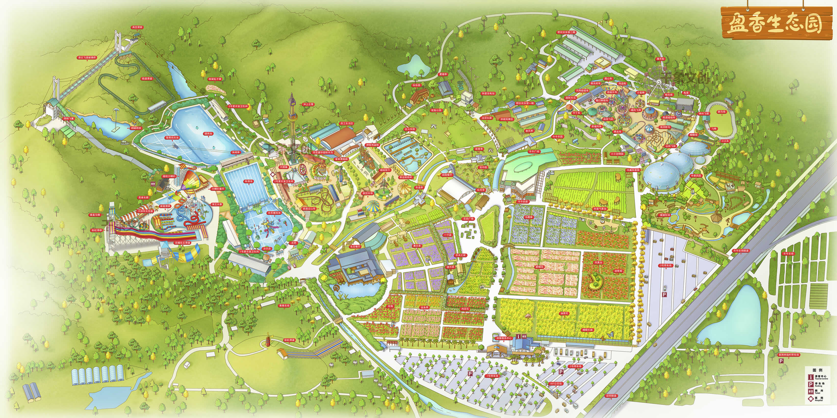 園內(nèi)設(shè)施主要包括有:凌云飛渡玻璃橋,水上樂(lè)園、百畝花海、科普王國(guó)、開(kāi)心農(nóng)場(chǎng)、尖叫歡樂(lè)世界、開(kāi)心牧場(chǎng)、抖樂(lè)園、彩虹滑道、野炊燒烤、手信店等。