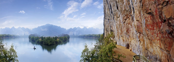 位于縣城西北25千米的明河畔,以其古老神奇的巖畫而聞名中外。花山巖畫是左江流域巖畫中的代表,也是世界同類巖畫中單位面積最大、畫面最集中、內(nèi)容最豐富、保存最完好的一處巖畫,被譽(yù)為是壯族文化的瑰寶。 1988年,花山巖畫被國(guó)務(wù)院列為全國(guó)重點(diǎn)文物保護(hù)單位。1998年,以花山巖畫為中心的花山風(fēng)景區(qū)被定為國(guó)家級(jí)風(fēng)景旅游名勝區(qū),成為與桂林漓江、桂平西山齊名的廣西三大國(guó)家級(jí)風(fēng)景旅游名勝區(qū)之一。2000年開始,國(guó)家文物局實(shí)施花山巖畫保護(hù)計(jì)劃,對(duì)保護(hù)巖畫進(jìn)行深入研究。2003年6月,寧明縣啟動(dòng)花山巖畫申遺工作。2004年11月,國(guó)家建設(shè)部把寧明縣花山巖畫列入《中國(guó)申報(bào)世界遺產(chǎn)預(yù)備名單》。
