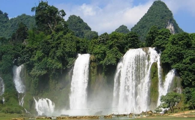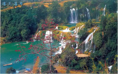 德天瀑布雄奇瑰麗,變幻多姿,碧水長流,永不涸歇。瀑布四季景色不同,春天凌草泛青,山花吐艷,瀑布四周被鑲起五彩繽紛的花邊;秋天梯田鋪金,層林盡染,高掛的銀簾霧氣沖天;冬天瓊珠閃閃,玉液潺瀑,山風(fēng)把細(xì)流吹得飄飄灑灑;夏天激流如