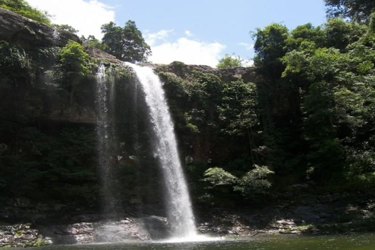 應天瀑布在十萬大山掃把山下,瑤寨念文屯西南3千米的山谷中。瀑布落山外,巖板稍平闊,水口呈“凹”狀,飛瀑處壁形,高28米,巖壁間有一凹處;深寬均數(shù)米,形似“水簾洞”。春夏大雨,山洪暴發(fā);瀑布響聲如雷,數(shù)里外還震人耳膜,“應天泉”由此而名。瀑下數(shù)十米,巨石如象;沉列溪中,同一溪流,距此瀑布約百米和二百米處,還有兩處小瀑布,高度均約十余米,當?shù)厝朔Q應天瀑布為“頭龍”,下面小瀑布為“二龍”和“三龍”。