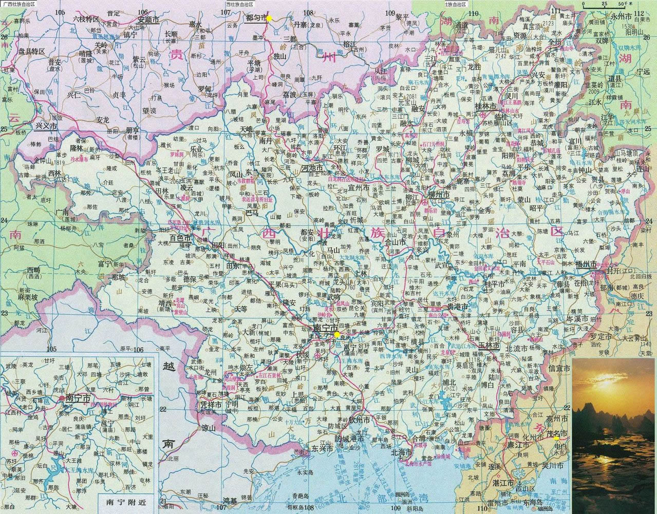 廣西河流眾多,清澈娟秀,在地域上多與奇峰相配,形成一派山環(huán)水繞,山水相依的秀麗景色。除舉世聞名的漓江外,景色優(yōu)美的還有融水的貝江、資源的資江、宜山的下規(guī)河、大新的黑水河、崇左的左江、寧明的明江等。湖泊風(fēng)景多以較大的湖泊或水面為主景,湖岸的山丘、原野和農(nóng)家村舍、田園風(fēng)光或城市風(fēng)貌等為襯景而組成。如桂林的榕湖、杉湖,南寧的南湖,柳州的龍?zhí)叮F港的東湖,陸川的龍珠湖等。此外,廣西還有不少水質(zhì)優(yōu)良、水面寬闊、群山環(huán)抱、湖光山色十分秀美的水庫,如靈川青獅潭、百色澄碧河、富川龜石、邕寧大王灘、合浦洪湖江、玉林寒山等水庫。