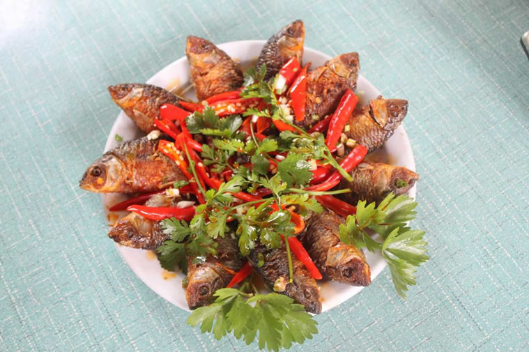 全州禾花魚 全州禾花魚,為長時期稻田放養(yǎng)馴化選育品種,因食水稻落花而得名。最遠可追溯至漢代,唐昭寧年間,劉恂在《嶺表錄異》中有詳細文字記載。乾隆時成朝廷貢品,譽滿京城。禾花魚年產(chǎn)兩次,總產(chǎn)量1000噸左右,以重約1兩至2兩,長約2至3寸為宜。有青蒸、水煮、紅燜、油炸、煎、火烤、煙熏等十余種吃法。