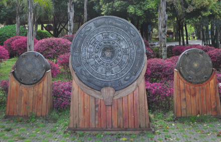 景區(qū)內(nèi)有廣西最大的銅鼓,在鼓面上,鑄造著壯人頂禮膜拜的圖騰——太陽與青蛙,壯人認(rèn)為青蛙是雷神的子女,求雨就要靠青蛙。