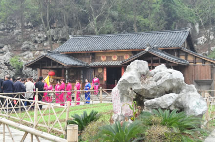 “如今廣西成歌海,都是三姐親口傳”。劉三姐是傳說中的壯族歌仙,她以山歌為武器,與土豪莫懷仁進(jìn)行了針鋒相對的斗爭。景區(qū)內(nèi)的豪宅就是莫懷仁居住的莫府。莫府坐北朝南,東青龍,左傍蒼翠秀美的西山;西白虎,右依靈氣生生的踩月山;南朱雀,前環(huán)美麗的桃花江;北玄武,背靠徐霞客記載過的獅子峰。