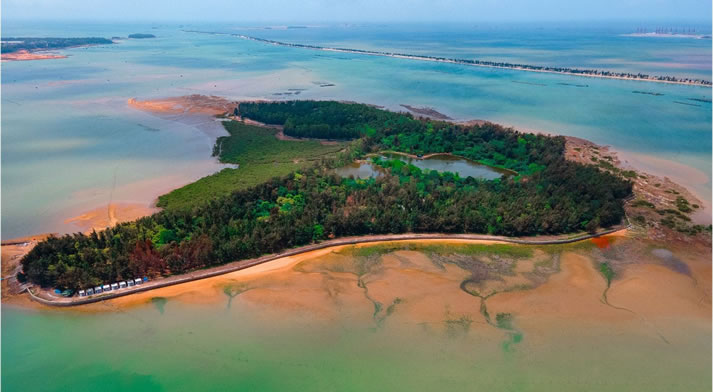 平山島,坐落在欽州城的南面,四面環(huán)水,與市區(qū)一水相隔土地平坦,林豐草茂,臨海的一面又突兀一座山峰,風(fēng)光旖旎,景色秀麗?滴鯉X標(biāo)準(zhǔn)海堤,全長(zhǎng)三十多千米, 號(hào)稱(chēng)廣西第一堤,俗稱(chēng)“海上長(zhǎng)城”。