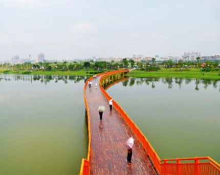 梧州園博園的整體景觀結(jié)構(gòu)為“一軸九片區(qū),三廊多節(jié)點”。一軸,指的是西入口的入園景觀軸,從西入口的龍湖大道開始,經(jīng)由跨湖橋一直延伸到東部山體;九片區(qū),是指沿著蒼海湖的東西兩岸,帶狀分布的原始地貌各異的九大片區(qū),分別為西岸濱水景觀區(qū)、水岸林舍片區(qū),蒼海公園片區(qū)等;三廊,指的市西岸親水綠廊,東岸濱水游憩體驗區(qū),以及核心城市展示廊。而多個各具特色的景觀節(jié)點,將有如明珠般分布在園博園各處,分別展示梧州的歷史文化、風(fēng)土人情,充分體現(xiàn)“西江明珠,嶺南新韻”的主題。