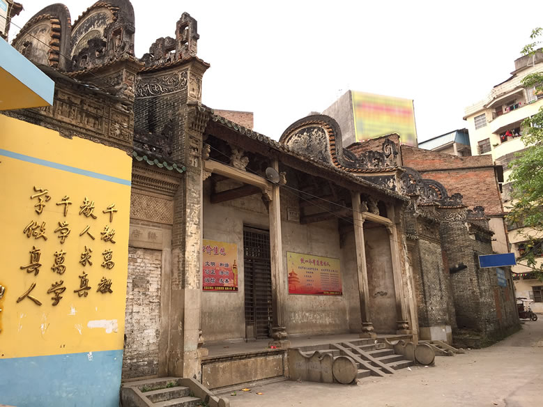 北流粵東會館位于今北流市城區(qū)永安路一里9號。始建于清乾隆二十年(1755年),建筑坐西向東,原規(guī)模為三進(jìn)兩廂兩天井一戲臺,占地面積1400平方米,現(xiàn)僅存兩進(jìn)一廂,占地面積642.6平方米。硬山頂磚木結(jié)構(gòu),鑊耳山墻,小青瓦屋面、青磚墻,抬梁穿斗式混合梁架。屋脊灰塑雙龍戲珠及博古紋,前座檐墻及廂房墻端堆砌陶瓷樓閣人物圖,檐廊柱間梁以石獅如意云柁墩作承重,三根枋墩雕刻人物及如意云紋,雀替透雕吉祥紋飾。中座內(nèi)有4根花崗巖石柱支撐屋頂。庭院及通道均鋪設(shè)紅色階磚和花崗巖條石。